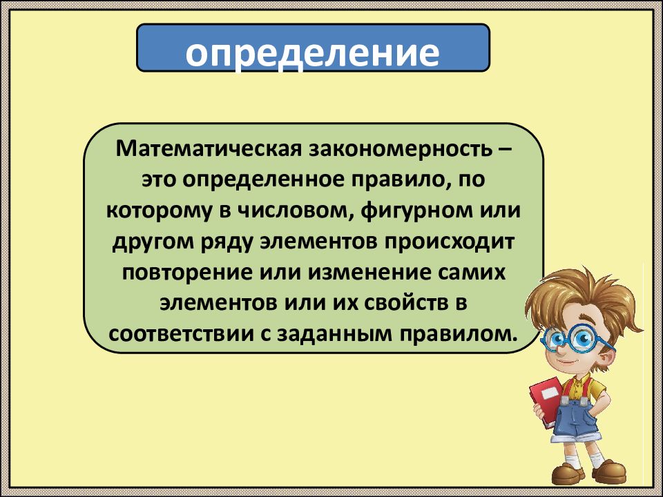 определение Математическая закономерность – это определенное правило, по которому в числовом, фигурном или другом ряду элементов происходит повторение или изменение самих элементов или их свойств в соответствии с заданным правилом.