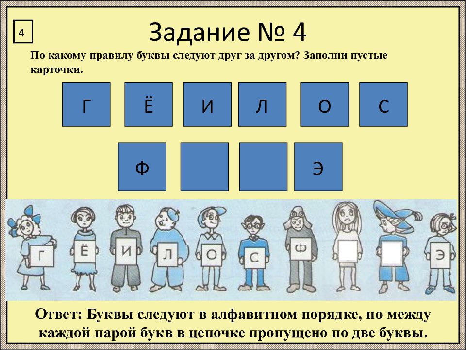 Г Ё И Л О С Ф Э Задание № 4 4 По какому правилу буквы следуют друг за другом? Заполни пустые карточки. Ответ: Буквы следуют в алфавитном порядке, но между каждой парой букв в цепочке пропущено по две буквы.