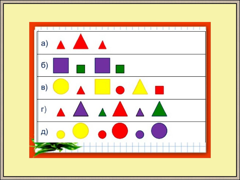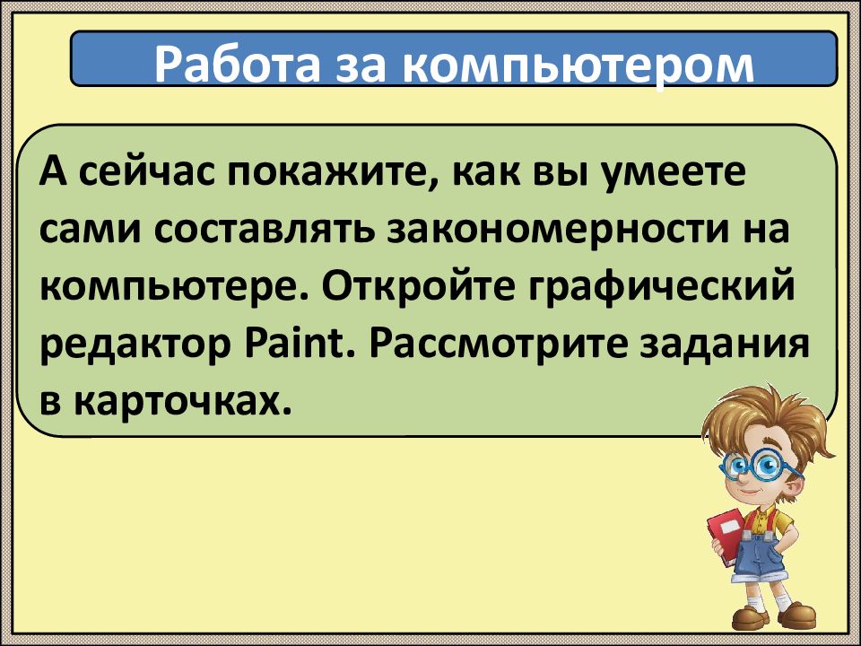 Работа за компьютером А сейчас покажите, как вы умеете сами составлять закономерности на компьютере. Откройте графический редактор Paint. Рассмотрите задания в карточках.