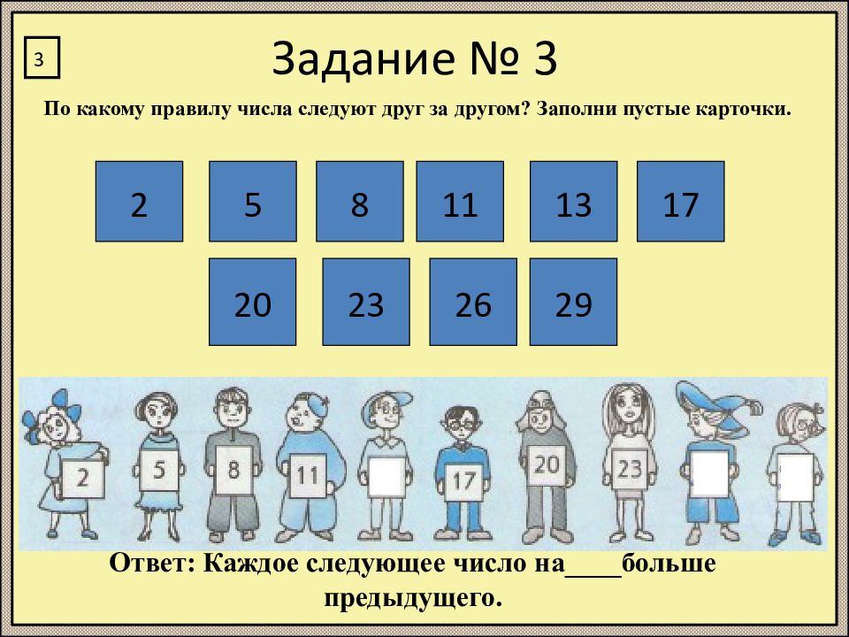 2 5 8 11 13 17 20 23 26 29 По какому правилу числа следуют друг за другом? Заполни пустые карточки. 3 Ответ: Каждое следующее число на____больше предыдущего.
