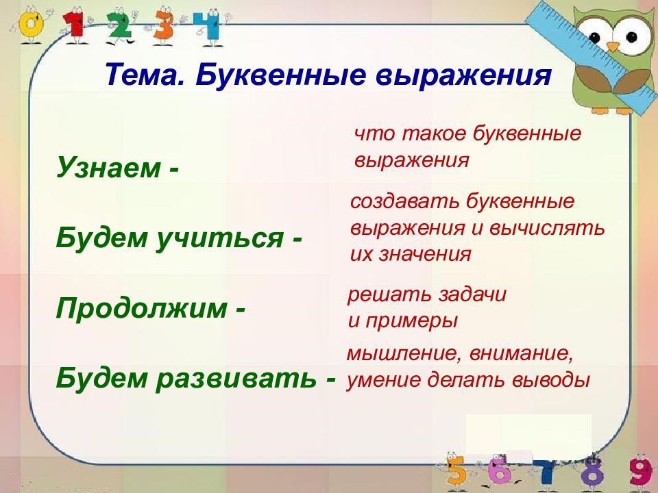 Тема. Буквенные выражения Узнаем - Б удем учиться - Продолжим - Будем развивать - ч то такое буквенные выражения с оздавать буквенные выражения и вычислять их значения р ешать задачи и примеры м ышление, внимание, умение делать выводы