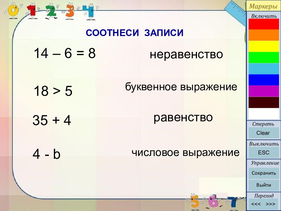 Маркеры Включить Стереть Выключить Переход Управление 14 – 6 = 8 СООТНЕСИ ЗАПИСИ б уквенное выражение 35 + 4 4 - b неравенство ч исловое выражение 18 > 5 равенство