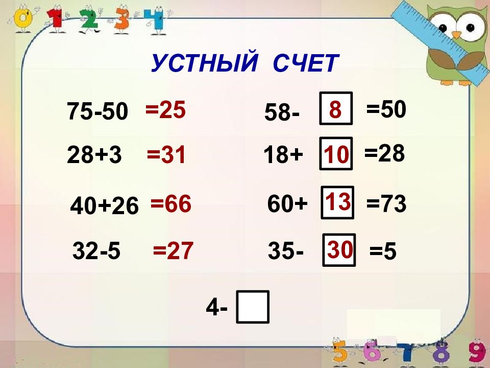 УСТНЫЙ СЧЕТ 75-50 28+3 40+26 32-5 =25 =31 =66 =27 58- 18+ 60+ 35- =50 =28 =73 =5 8 10 13 30 4-