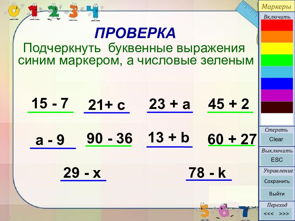 Маркеры Включить Стереть Выключить Переход Управление ПРОВЕРКА Подчеркнуть буквенные выражения с иним маркером, а числовые зеленым a - 9 15 - 7 60 + 27 21+ с 90 - 36 78 - k 23 + a 45 + 2 13 + b 29 - x