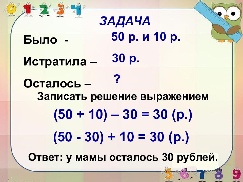 10 + a, если a = 20, 17, 4 10 + 20 = 30 10 + 4 = 14 РАБОТА В ПАРАХ 35 - c, если c = 20, 25, 5 35 - 20 = 15 35 – 25 = 10 10 + 17 = 27 35 – 5 = 30