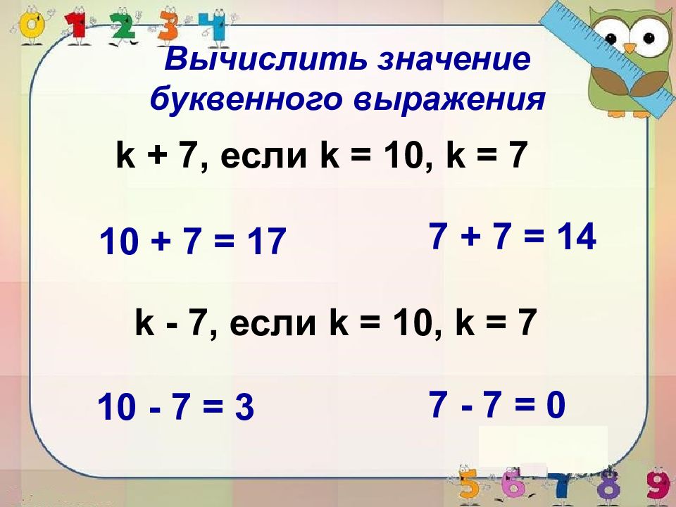 k + 7, если k = 10, k = 7 10 + 7 = 17 7 + 7 = 14 Вычислить значение буквенного выражения k - 7, если k = 10, k = 7 10 - 7 = 3 7 - 7 = 0