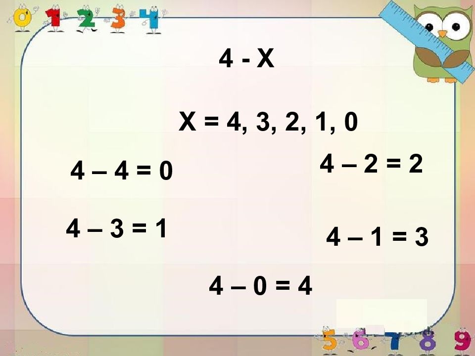 4 - X X = 4, 3, 2, 1, 0 4 – 4 = 0 4 – 3 = 1 4 – 0 = 4 4 – 1 = 3 4 – 2 = 2