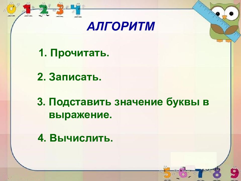 АЛГОРИТМ 1. Прочитать. 2. Записать. 3. Подставить значение буквы в выражение. 4. Вычислить.