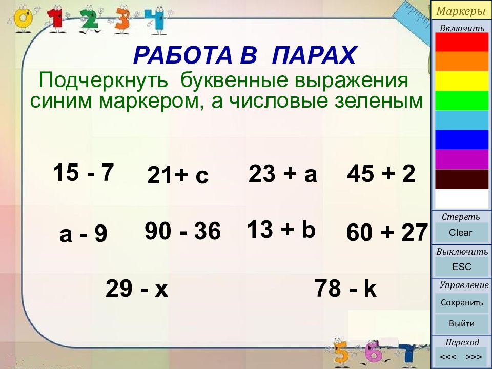 Маркеры Включить Стереть Выключить Переход Управление РАБОТА В ПАРАХ Подчеркнуть буквенные выражения с иним маркером, а числовые зеленым a - 9 15 - 7 60 + 27 21+ с 90 - 36 78 - k 23 + a 45 + 2 13 + b 29 - x