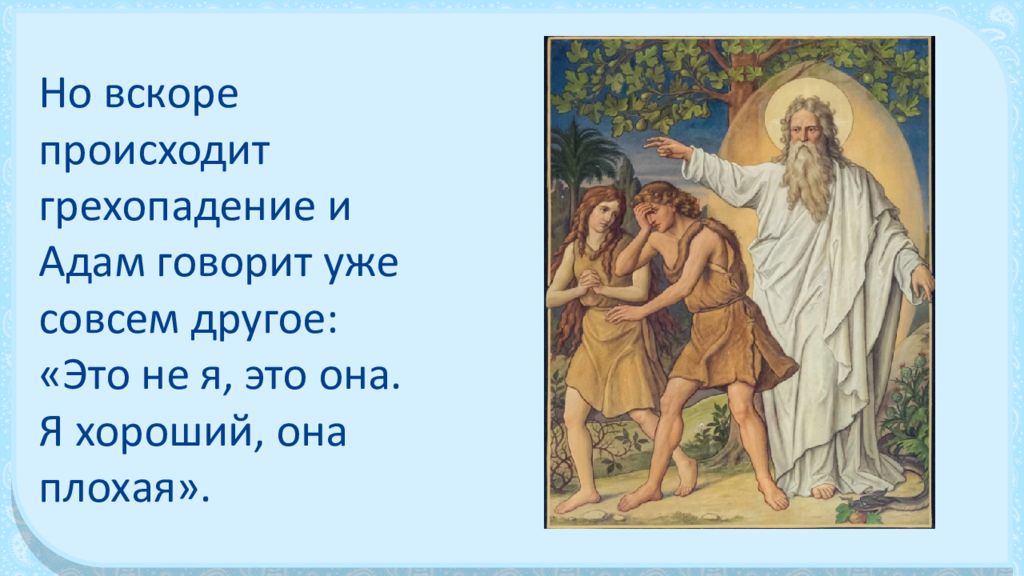 Но вскоре происходит грехопадение и Адам говорит уже совсем другое: «Это не я, это она. Я хороший, она плохая».