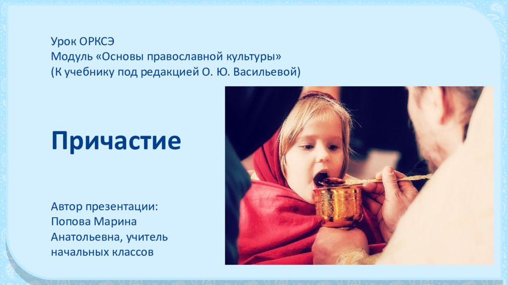 Урок ОРКСЭ Модуль «Основы православной культуры» (К учебнику под редакцией О. Ю. Васильевой) Причастие Автор презентации: Попова Марина Анатольевна, учитель начальных классов