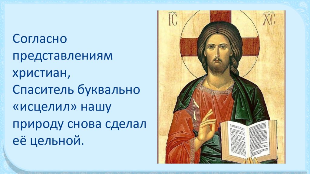 Согласно представлениям христиан, Спаситель буквально «исцелил» нашу природу снова сделал её цельной.