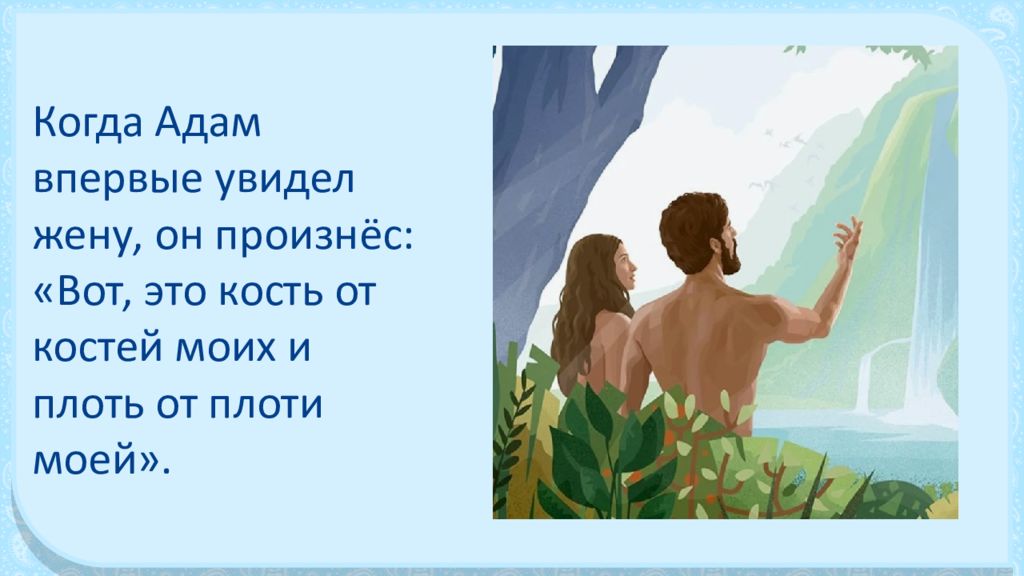 Когда Адам впервые увидел жену, он произнёс: «Вот, это кость от костей моих и плоть от плоти моей».