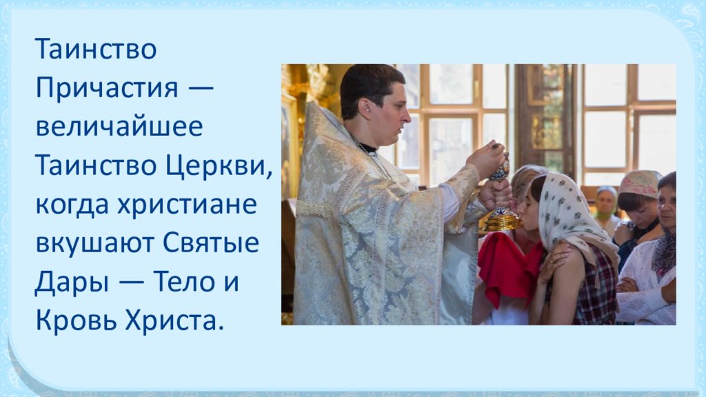 Таинство Причастия — величайшее Таинство Церкви, когда христиане вкушают Святые Дары — Тело и Кровь Христа.