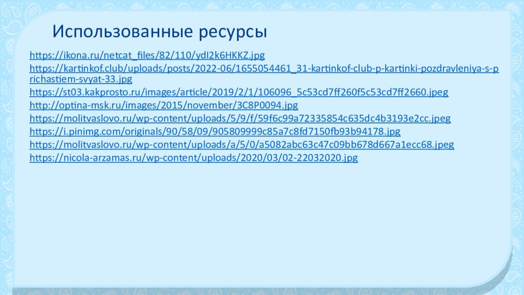 Использованные ресурсы https://ikona.ru/netcat_files/82/110/ydI2k6HKKZ.jpg https://kartinkof.club/uploads/posts/2022-06/1655054461_31-kartinkof-club-p-kartinki-pozdravleniya-s-prichastiem-svyat-33.jpg https://st03.kakprosto.ru/images/article/2019/2/1/106096_5c53cd7ff260f5c53cd7ff2660.jpeg http://optina-msk.ru/images/2015/november/3C8P0094.jpg https://molitvaslovo.ru/wp-content/uploads/5/9/f/59f6c99a72335854c635dc4b3193e2cc.jpeg https://i.pinimg.com/originals/90/58/09/905809999c85a7c8fd7150fb93b94178.jpg https://molitvaslovo.ru/wp-content/uploads/a/5/0/a5082abc63c47c09bb678d667a1ecc68.jpeg https://nicola-arzamas.ru/wp-content/uploads/2020/03/02-22032020.jpg