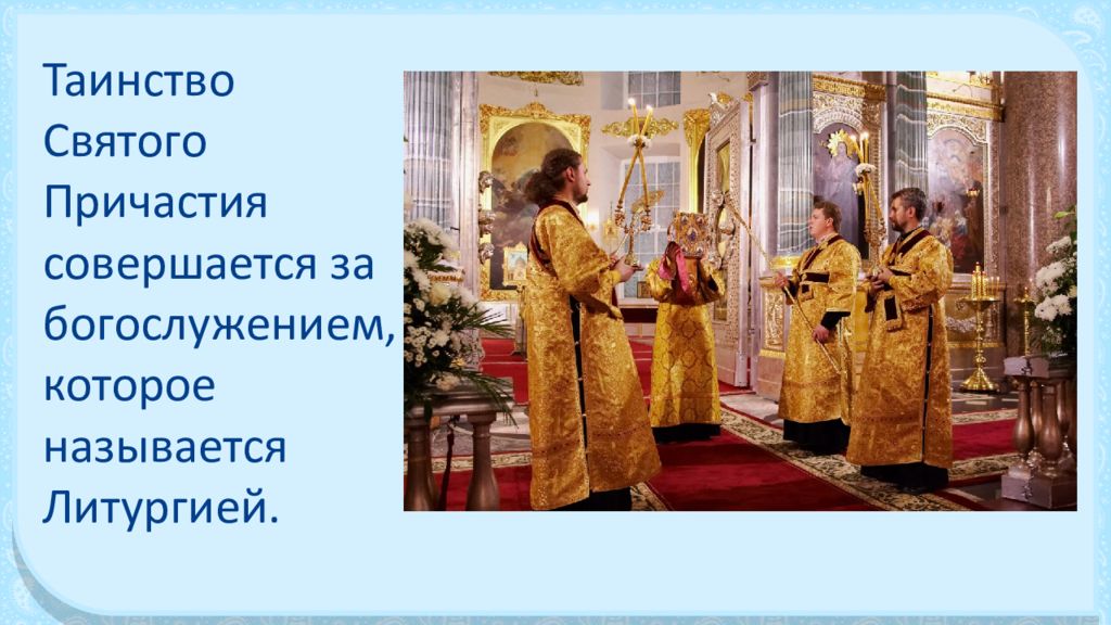 Таинство Святого Причастия совершается за богослужением, которое называется Литургией.