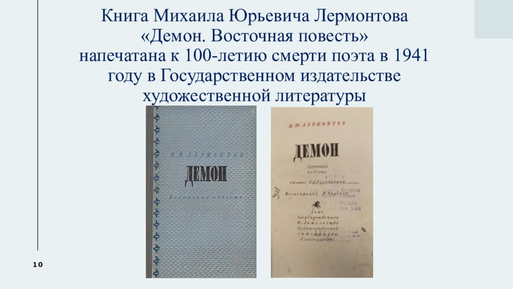 Слайд 10: Книга Михаила Юрьевича Лермонтова «Демон. Восточная повесть» напечатана к 100-летию смерти поэта в 1941 году в Государственном издательстве художественной литературы
