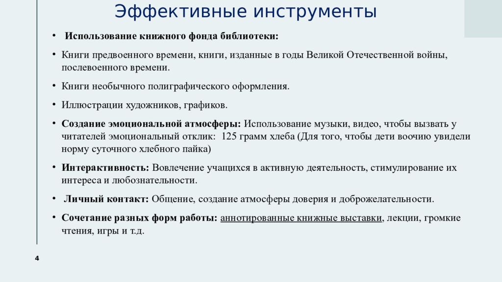 Использование книжного фонда библиотеки: Книги предвоенного времени, книги, изданные в годы Великой Отечественной войны, послевоенного времени. Книги необычного полиграфического оформления. Иллюстрации художников, графиков. Создание эмоциональной атмосферы: Использование музыки, видео, чтобы вызвать у читателей эмоциональный отклик: 125 грамм хлеба (Для того, чтобы дети воочию увидели норму суточного хлебного пайка) Интерактивность: Вовлечение учащихся в активную деятельность, стимулирование их интереса и любознательности. Личный контакт: Общение, создание атмосферы доверия и доброжелательности. Сочетание разных форм работы: аннотированные книжные выставки, лекции, громкие чтения, игры и т.д. 4