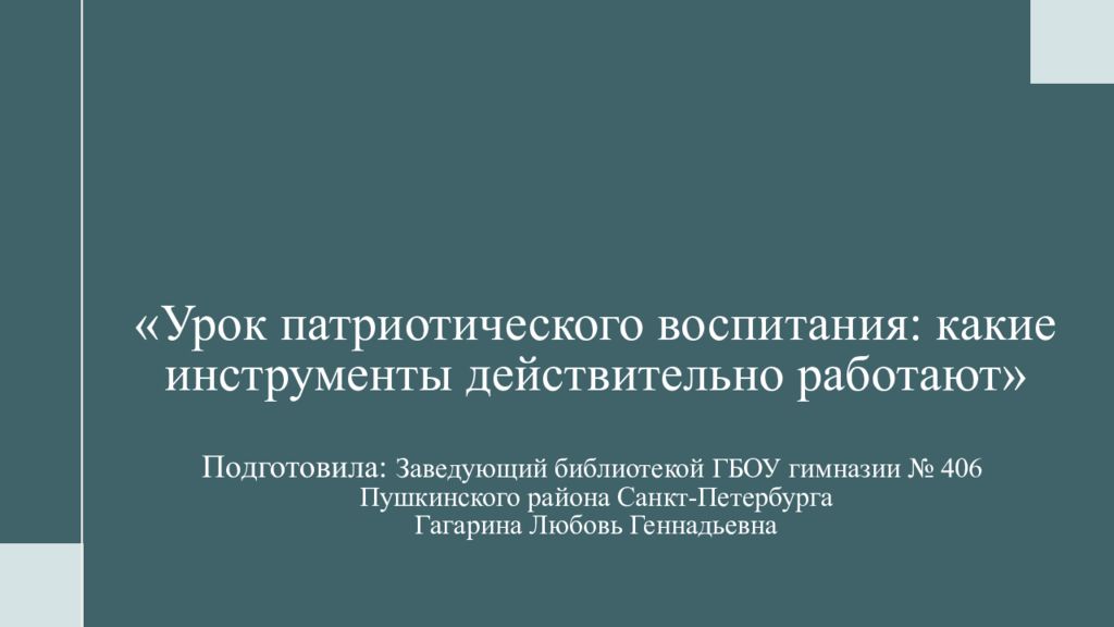 Первый слайд презентации: Урок патриотического воспитания: какие инструменты действительно работают» Подготовила: Заведующий библиотекой ГБОУ гимназии № 406 Пушкинского района Санкт-Петербурга Гагарина Любовь Геннадьевна