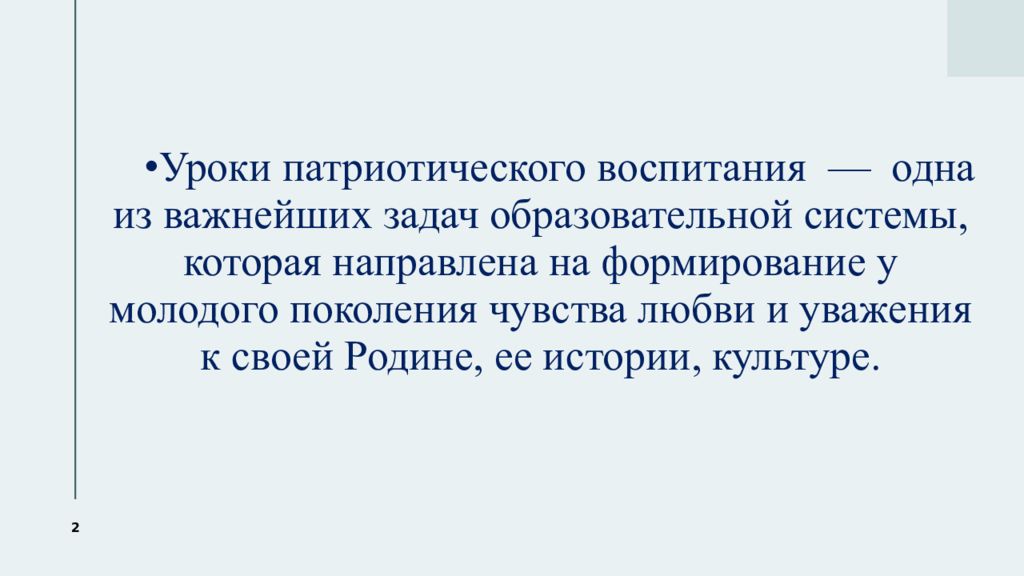 Уроки патриотического воспитания — одна из важнейших задач образовательной системы, которая направлена на формирование у молодого поколения чувства любви и уважения к своей Родине, ее истории, культуре. 2