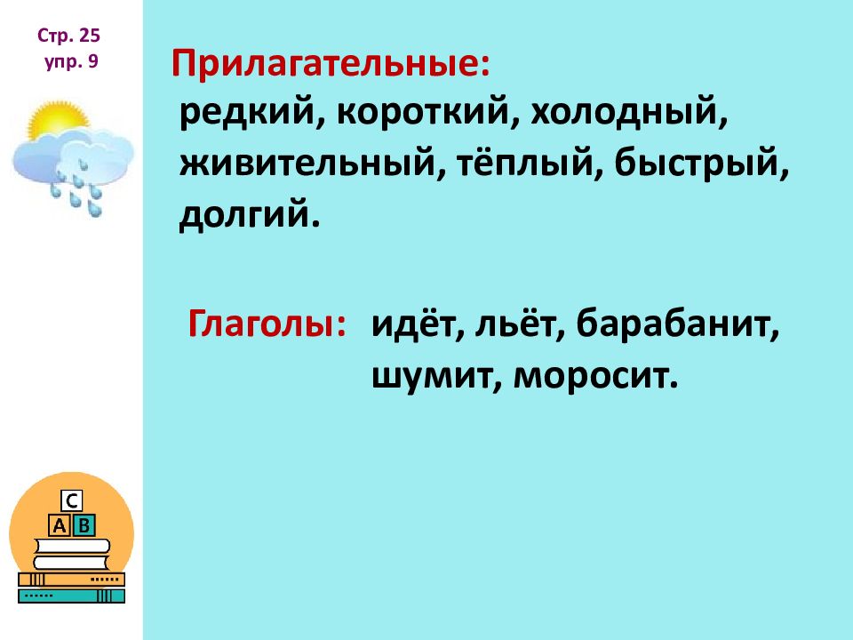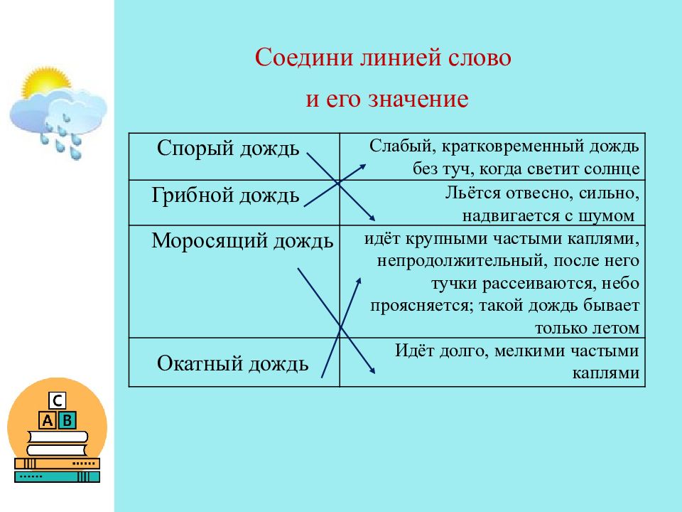 Спорый дождь Слабый, кратковременный дождь без туч, когда светит солнце Грибной дождь Льётся отвесно, сильно, надвигается с шумом Моросящий дождь идёт крупными частыми каплями, непродолжительный, после него тучки рассеиваются, небо проясняется; такой дождь бывает только летом Окатный дождь Идёт долго, мелкими частыми каплями Соедини линией слово и его значение