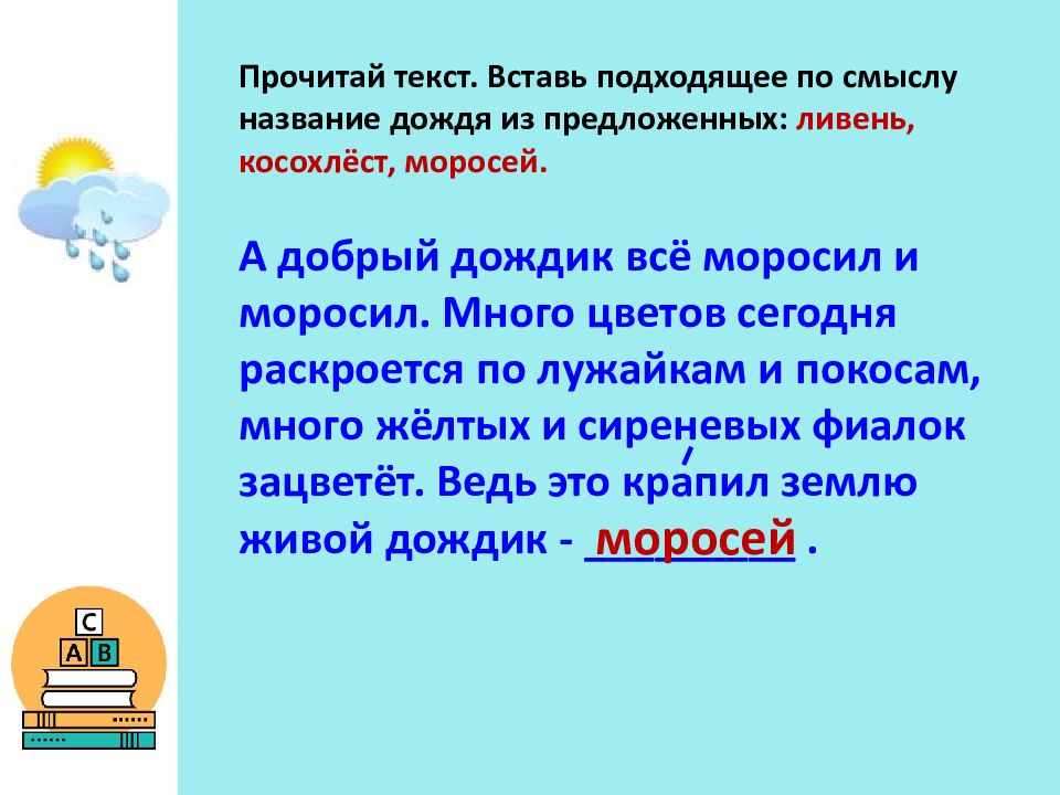 Прочитай текст. Вставь подходящее по смыслу название дождя из предложенных: ливень, косохлёст, моросей. А добрый дождик всё моросил и моросил. Много цветов сегодня раскроется по лужайкам и покосам, много жёлтых и сиреневых фиалок зацветёт. Ведь это крапил землю живой дождик - _________. моросей