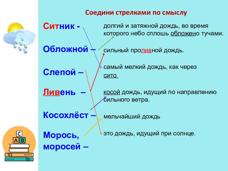 Соедини стрелками по смыслу Сит ник - Обложной – Слепой – Лив ень – Косохлёст – Морось, моросей – долгий и затяжной дождь, во время которого небо сплошь обложен о тучами. сильный про лив ной дождь. самый мелкий дождь, как через сито косой дождь, идущий по направлению сильного ветра. мельчайший дождь это дождь, идущий при солнце.