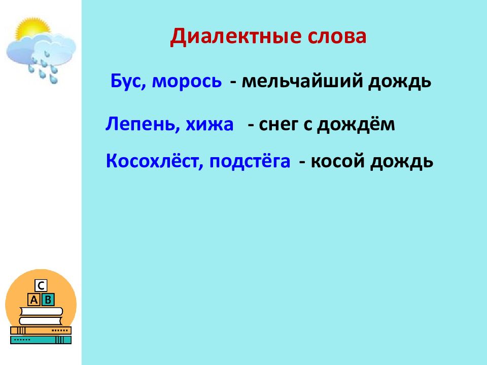 Диалектные слова Бус, морось - мельчайший дождь Лепень, хижа - снег с дождём Косохлёст, подстёга - косой дождь