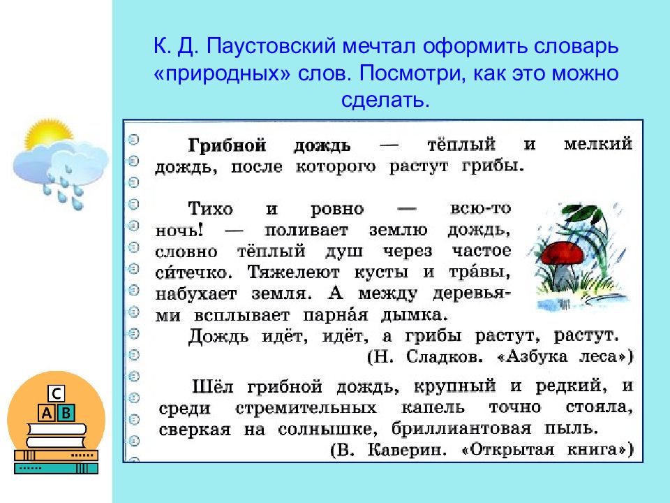 К. Д. Паустовский мечтал оформить словарь «природных» слов. Посмотри, как это можно сделать.