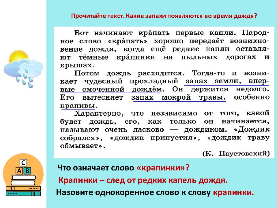 Прочитайте текст. Какие запахи появляются во время дождя? Что означает слово «крапинки»? Крапинки – след от редких капель дождя. Назовите однокоренное слово к слову крапинки.