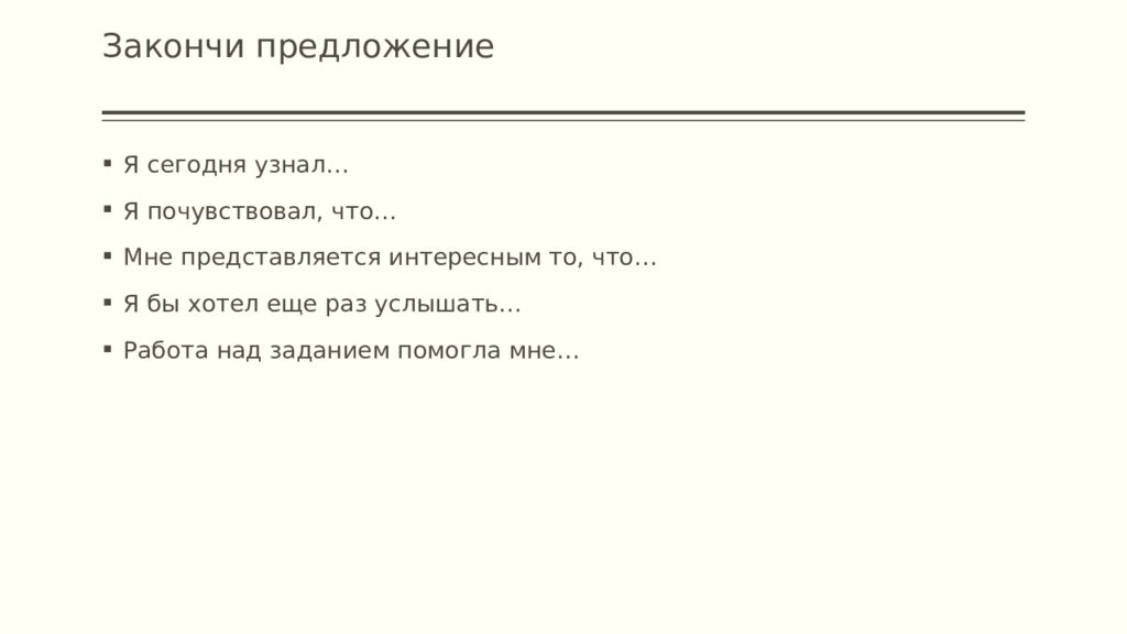 Я сегодня узнал… Я почувствовал, что… Мне представляется интересным то, что… Я бы хотел еще раз услышать… Работа над заданием помогла мне…