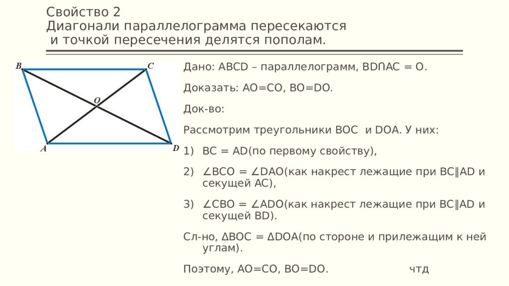 Дано: ABCD – параллелограмм, BD ᑎ AC = O. Доказать: AO=CO, BO=DO. Док-во : Рассмотрим треугольники BOC и DOA. У них: BC = AD( по первому свойству), ∠ B С O = ∠ D А O( как накрест лежащие при BC ∥ AD и секущей AC ), ∠ CBO = ∠ ADO( как накрест лежащие при BC ∥ AD и секущей BD ). Сл-но, ᐃ BOC = ᐃ DOA (по стороне и прилежащим к ней углам). Поэтому, AO=CO, BO=DO. чтд