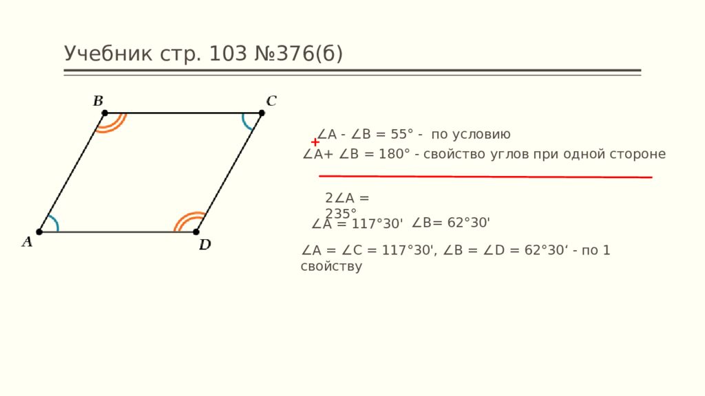 ∠ A+ ∠ B = 180° - свойство углов при одной стороне ∠ A - ∠ B = 55° - по условию + 2∠ A = 235 ° ∠ A = 117 ° 30' ∠ B= 62° 30' ∠ A = ∠ C = 117 ° 30', ∠ B = ∠ D = 62° 30‘ - по 1 свойству