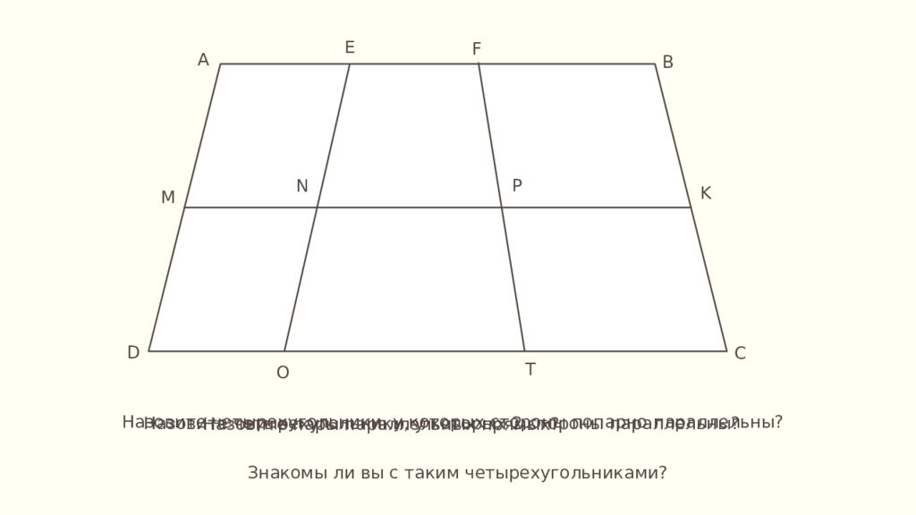 A B C D E F K M O T N P Назовите пары параллельных прямых? Назовите четырехугольники, у которых 2 стороны параллельны? Назовите четырехугольники, у которых стороны попарно параллельны? Знакомы ли вы с таким четырехугольниками?