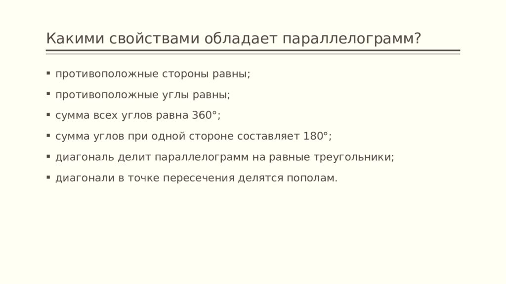 Слайд 9: Какими свойствами обладает параллелограмм?