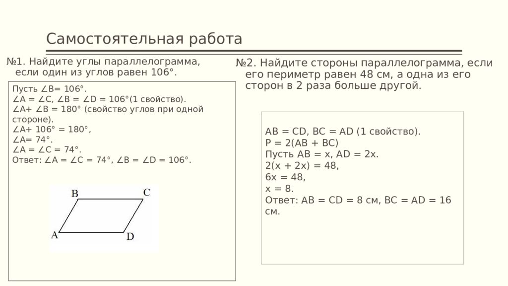 №1. Найдите углы параллелограмма, если один из углов равен 106°. №2. Найдите стороны параллелограмма, если его периметр равен 48 см, а одна из его сторон в 2 раза больше другой. Пусть ∠ B= 106 °. ∠ A = ∠ C, ∠ B = ∠ D = 106 ° (1 свойство). ∠ A+ ∠ B = 180° (свойство углов при одной стороне). ∠ A+ 106 ° = 180 °, ∠ A= 74 °. ∠ A = ∠ C = 74 °. Ответ: ∠ A = ∠ C = 74 °, ∠ B = ∠ D = 106 °. AB = CD, BC = AD (1 свойство). P = 2(AB + BC) Пусть AB = x, AD = 2x. 2(x + 2x) = 48, 6x = 48, x = 8. Ответ: AB = CD = 8 см, BC = AD = 16 см.