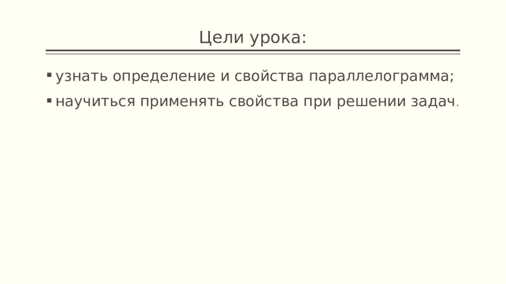 узнать определение и свойства параллелограмма; научиться применять свойства при решении задач.
