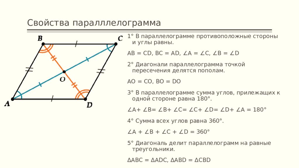 1° В параллелограмме противоположные стороны и углы равны. AB = CD, BC = AD, ∠ A = ∠ C, ∠ B = ∠ D 2° Диагонали параллелограмма точкой пересечения делятся пополам. АО = CO, BO = DO 3° В параллелограмме сумма углов, прилежащих к одной стороне равна 180°. ∠ A+ ∠ B= ∠ B+ ∠ C= ∠ C+ ∠ D= ∠ D+ ∠ A = 180° 4° Сумма всех углов равна 360°. ∠ A + ∠ B + ∠ C + ∠ D = 36 0° 5° Диагональ делит параллелограмм на равные треугольники. ᐃ ABC = ᐃ ADC, ᐃ ABD = ᐃ CBD