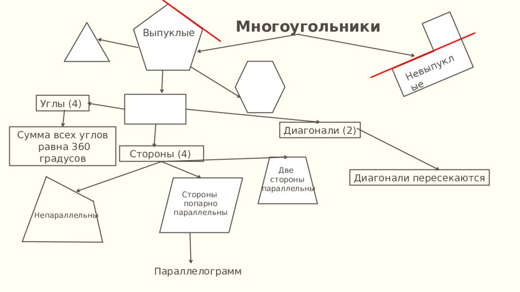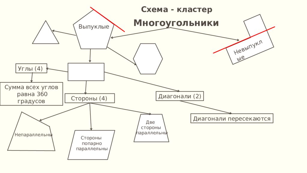 Выпуклые Невыпуклые Углы (4) Стороны (4) Диагонали (2) Сумма всех углов равна 360 градусов Диагонали пересекаются Непараллельны Две стороны параллельны Стороны попарно параллельны Схема - кластер