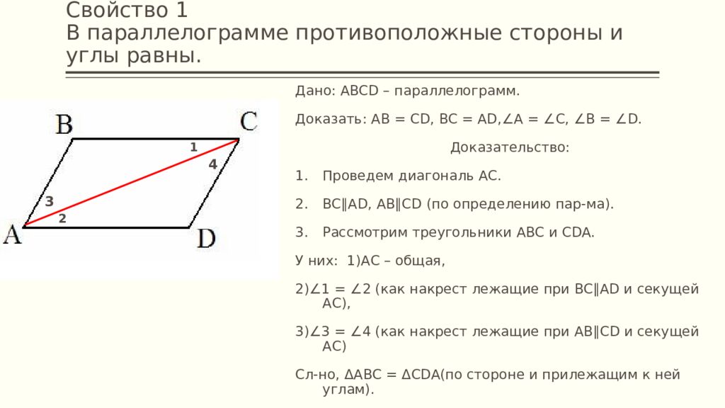Дано: ABCD – параллелограмм. Доказать: AB = CD, BC = AD,∠ A = ∠ C, ∠ B = ∠ D. Доказательство: Проведем диагональ AC. BC ∥ AD, AB ∥ CD (по определению пар - ма ). Рассмотрим треугольники ABC и CDA. У них: 1)АС – общая, 2)∠1 = ∠2 (как накрест лежащие при BC ∥ AD и секущей АС), 3)∠3 = ∠4 (как накрест лежащие при AB ∥ CD и секущей АС) Сл-но, ᐃ ABC = ᐃ CDA (по стороне и прилежащим к ней углам). Поэтому, AB = CD, BC = AD,∠ A = ∠ C, ∠ B = ∠ D. чтд 1 2 3 4