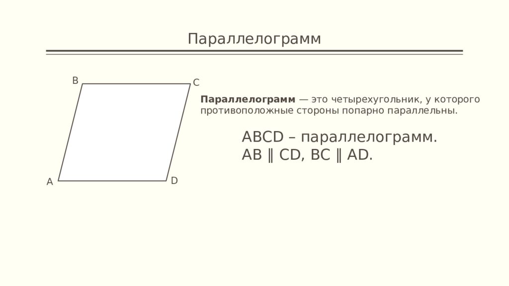 A B C D Параллелограмм — это четырехугольник, у которого противоположные стороны попарно параллельны. ABCD – параллелограмм. AB ∥ CD, BC ∥ AD.