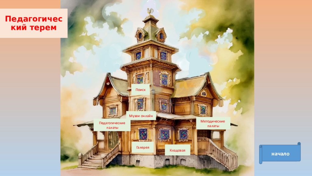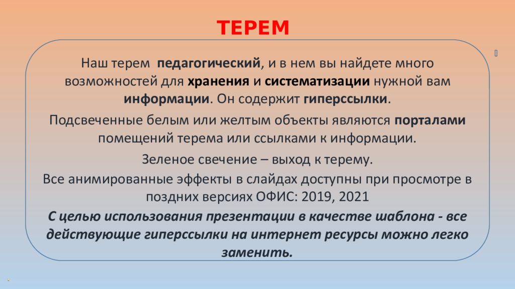Наш терем педагогический, и в нем вы найдете много возможностей для хранения и систематизации нужной вам информации. Он содержит гиперссылки. Подсвеченные белым или желтым объекты являются порталами помещений терема или ссылками к информации. Зеленое свечение – выход к терему. Все анимированные эффекты в слайдах доступны при просмотре в поздних версиях ОФИС: 2019, 2021 С целью использования презентации в качестве шаблона - все действующие гиперссылки на интернет ресурсы можно легко заменить.