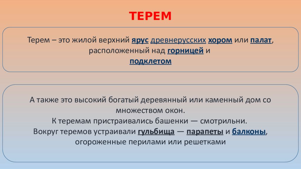 Терем – это жилой верхний ярус древнерусских хором или палат, расположенный над горницей и подклетом А также это высокий богатый деревянный или каменный дом со множеством окон. К теремам пристраивались башенки — смотрильни. Вокруг теремов устраивали гульбища — парапеты и балконы, огороженные перилами или решетками