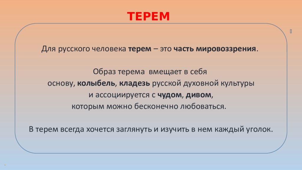 Для русского человека терем – это часть мировоззрения. Образ терема вмещает в себя основу, колыбель, кладезь русской духовной культуры и ассоциируется с чудом, дивом, которым можно бесконечно любоваться. В терем всегда хочется заглянуть и изучить в нем каждый уголок.