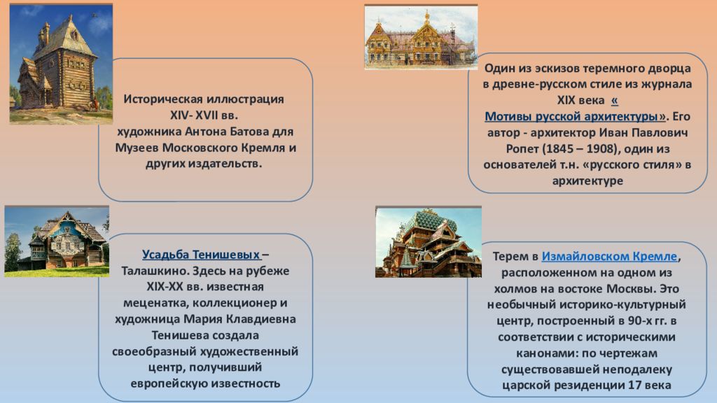 Усадьба Тенишевых – Талашкино. Здесь на рубеже XIX-XX вв. известная меценатка, коллекционер и художница Мария Клавдиевна Тенишева создала своеобразный художественный центр, получивший европейскую известность Один из эскизов теремного дворца в древне-русском стиле из журнала XIX века « Мотивы русской архитектуры ». Его автор - архитектор Иван Павлович Ропет (1845 – 1908), один из основателей т.н. «русского стиля» в архитектуре Терем в Измайловском Кремле, расположенном на одном из холмов на востоке Москвы. Это необычный историко-культурный центр, построенный в 90-х гг. в соответствии с историческими канонами: по чертежам существовавшей неподалеку царской резиденции 17 века Историческая иллюстрация XIV- XVII вв. художника Антона Батова для Музеев Московского Кремля и других издательств. Терем – это жилой верхний ярус древнерусских хором или палат, расположенный над горницей и подклетом Терм – это высокий богатый деревянный или каменный дом со множеством окон. К теремам пристраивались башенки — смотрильни. Вокруг теремов устраивали гульбища — парапеты и балконы, огороженные перилами или решетками