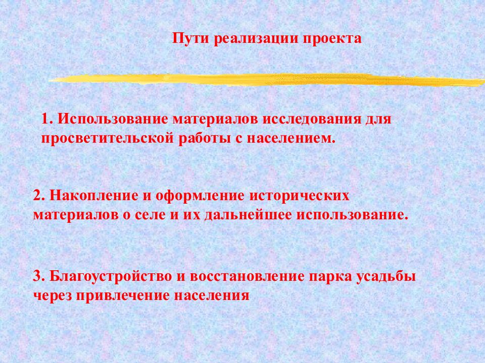 Пути реализации проекта 1. Использование материалов исследования для просветительской работы с населением. 2. Накопление и оформление исторических материалов о селе и их дальнейшее использование. 3. Благоустройство и восстановление парка усадьбы через привлечение населения