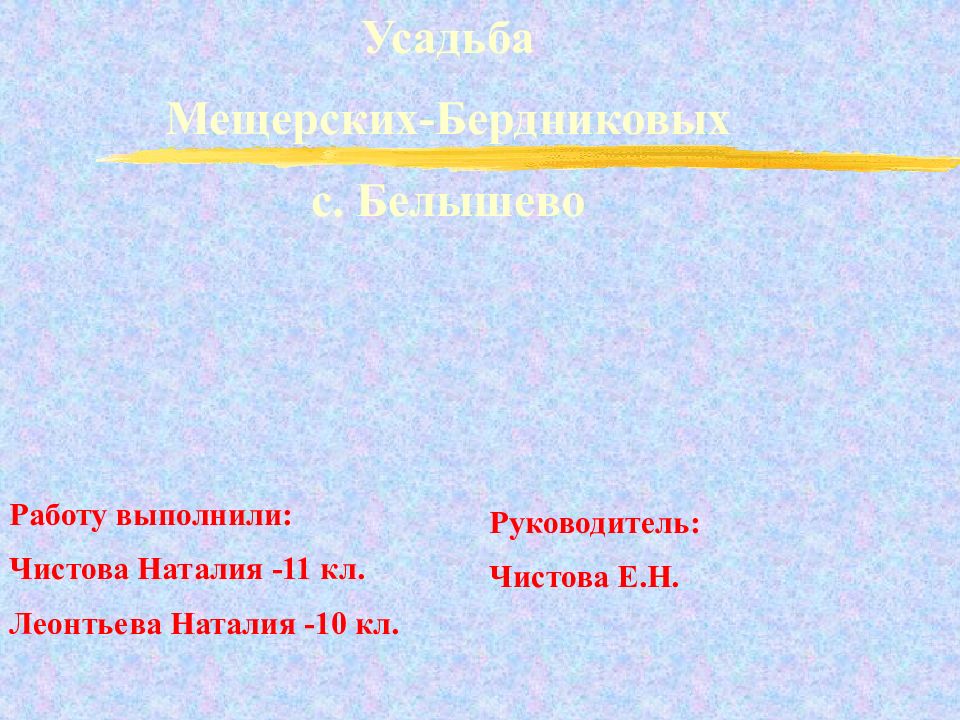 Последний слайд презентации: Усадьба Мещерских-Бердниковых с. Белышево Работу выполнили: Чистова Наталия -11