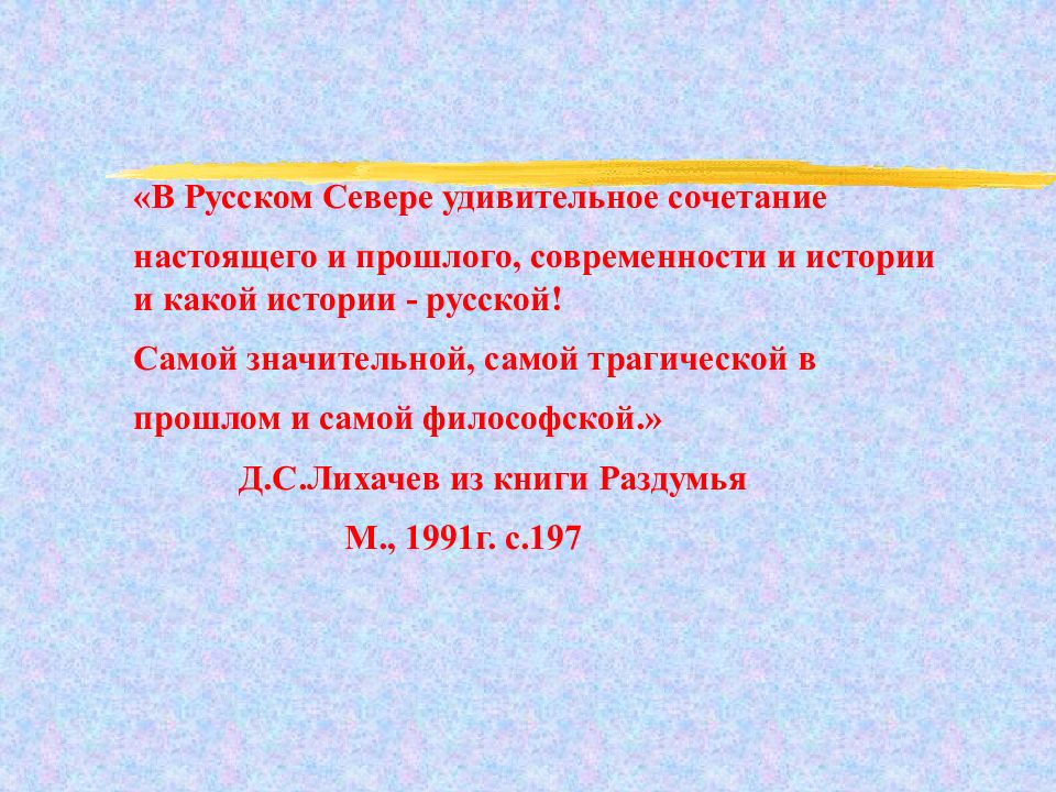 «В Русском Севере удивительное сочетание настоящего и прошлого, современности и истории и какой истории - русской! Самой значительной, самой трагической в прошлом и самой философской.» Д.С.Лихачев из книги Раздумья М., 1991г. с.197