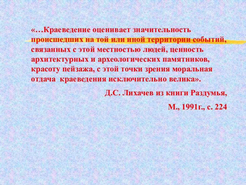 «…Краеведение оценивает значительность происшедших на той или иной территории событий, связанных с этой местностью людей, ценность архитектурных и археологических памятников, красоту пейзажа, с этой точки зрения моральная отдача краеведения исключительно велика». Д.С. Лихачев из книги Раздумья, М., 1991г., с. 224
