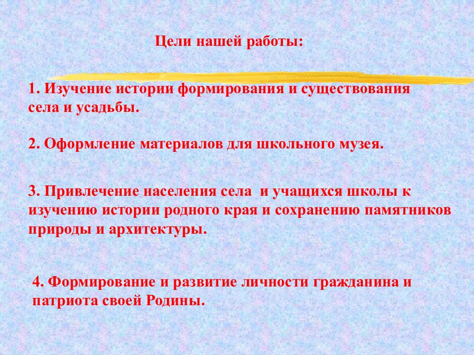 Цели нашей работы: 1. Изучение истории формирования и существования села и усадьбы. 2. Оформление материалов для школьного музея. 3. Привлечение населения села и учащихся школы к изучению истории родного края и сохранению памятников природы и архитектуры. 4. Формирование и развитие личности гражданина и патриота своей Родины.